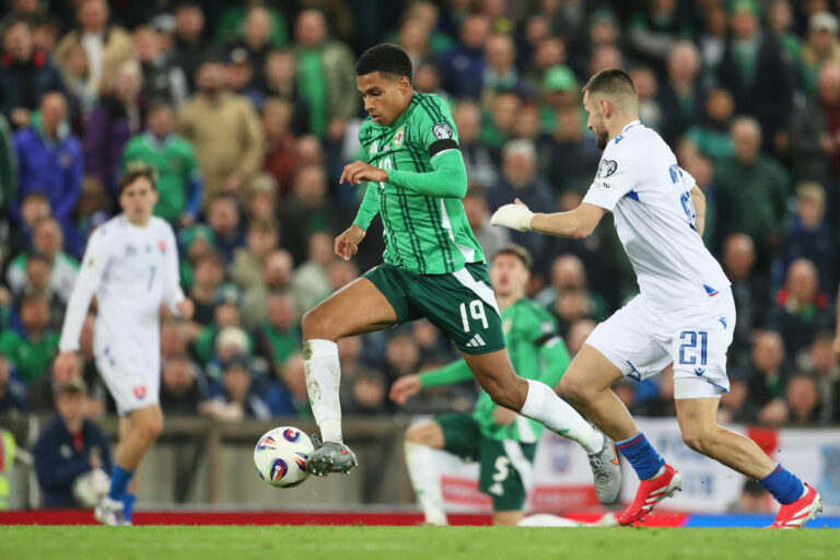Conor Bradley zo Severného Írska (vľavo) a Adam Obert zo Slovenska počas zápasu A-skupiny kvalifikácie o postup na MS vo futbale 2026. Belfast, 10. október 2025. Foto: SITA/AP