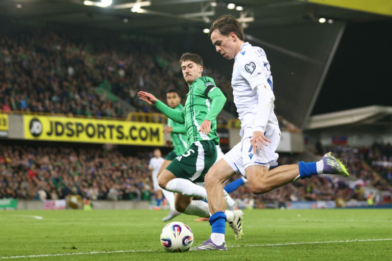 Shea Charles zo Severného Írska (vľavo) sa snaží úniknúť Matúšovi Berovi zo Slovenska počas zápasu A-skupiny kvalifikácie o postup na MS vo futbale 2026. Belfast, 10. október 2025. Foto: SITA/AP