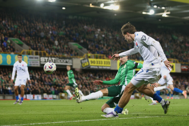 Leo Sauer zo Slovenska (vpravo) prihráva loptu počas zápasu A-skupiny kvalifikácie o postup na MS vo futbale 2026 proti Severnému Írsku. Belfast, 10. október 2025. Foto: SITA/AP