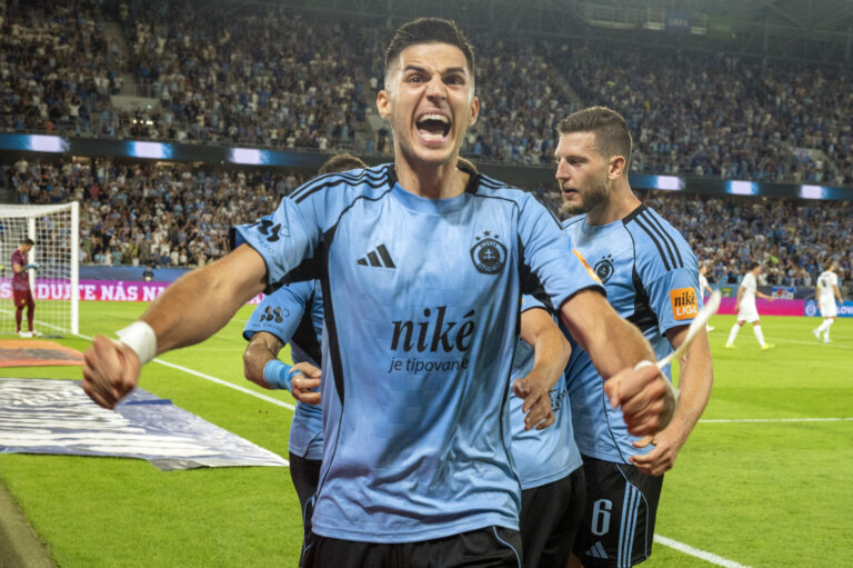 Róbert Mak z ŠK Slovan Bratislava sa teší z gólu na 1:0 v zápase proti Kajratu Almaty v odvete 3. kvalifikačného kola Ligy majstrov 2025/2026. Bratislava, 12. august 2025. Foto: SITA/Milan Illík