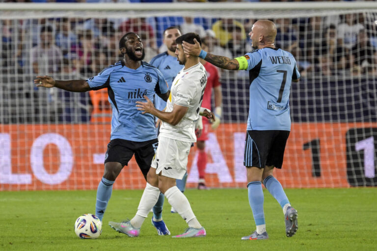 Sandro Cruz (vľavo) a Vladimír Weiss z ŠK Slovan Bratislava počas odvetného zápasu 3. predkola Ligy majstrov 2025/2026 proti Kajratu Almaty. Bratislava (Tehelné pole), 12. august 2025. Foto: SITA/Milan Illík.