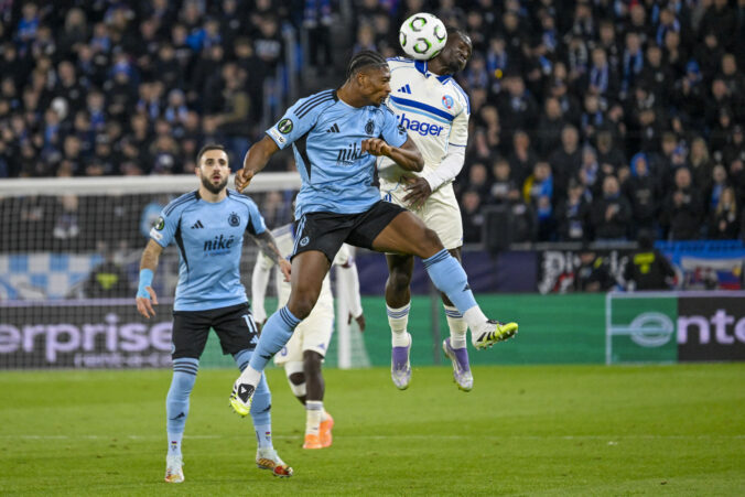 Sprava: Martial Godo a Kendry Páez, obaja z RC Štrasburg sa tešia po vlastnom góle Alasana Yirajanga z ŠK Slovan Bratislava počas futbalového zápasu hlavnej fázy Konferenčnej ligy UEFA 2025/26 medzi ŠK Slovan Bratislava – RC Štrasburg. Bratislava, 2. október 2025. Foto: SITA/Milan Illík