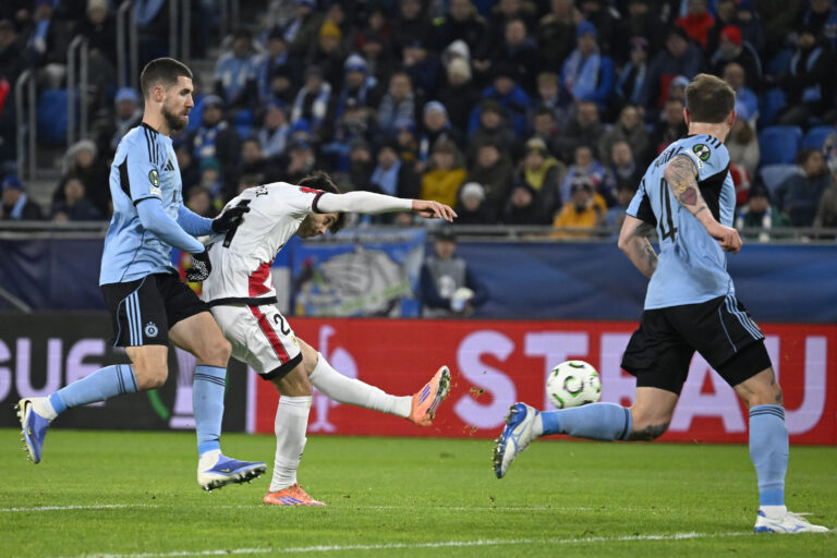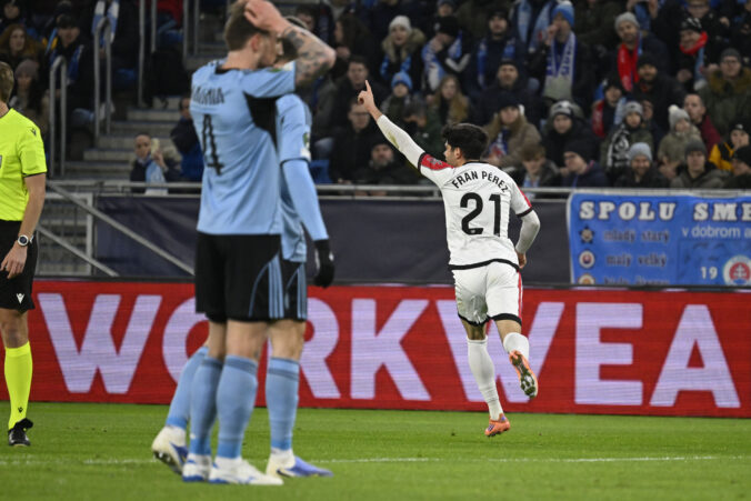 Fran Pérez (Rayo Vallecano) strieľa úvodný gól zápasu proti Slovanu Bratislava v ligovej fáze Európskej konferenčnej ligy 2025/2026. Bratislava (Tehelné pole / Národný futbalový štadión), 27. november 2025. Foto: SITA/Milan Illík.