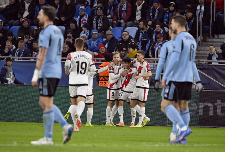 Fran Pérez z Rayo Vallecano (uprostred v pozadí) sa so spoluhráčmi teší zo svojho gólu na 1:0 v zápase proti Slovanu Bratislave v 4. kole ligovej fázy Európskej konferenčnej ligy 2025/2026. Bratislava (Tehelné pole / Národný futbalový štadión), 27. november 2025. Foto: SITA/Milan Illík.