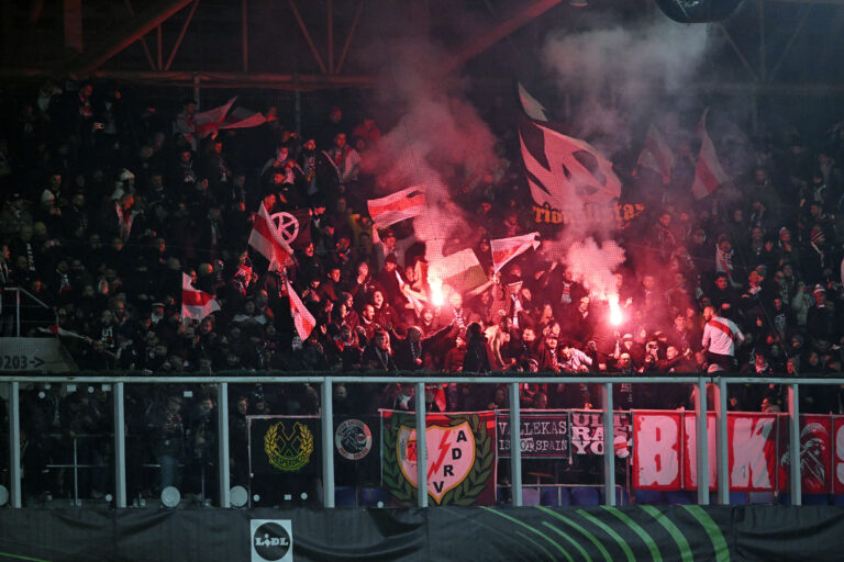 Fanúšikovia Raya Vallecano v zápase ich tímu proti Slovanu Bratislava v 4. kole ligovej fázy Európskej konferenčnej ligy 2025/2026. Bratislava (Tehelné pole / Národný futbalový štadión), 27. november 2025. Foto: SITA/Milan Illík.
