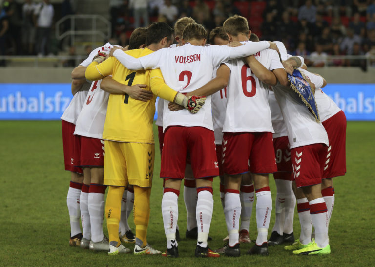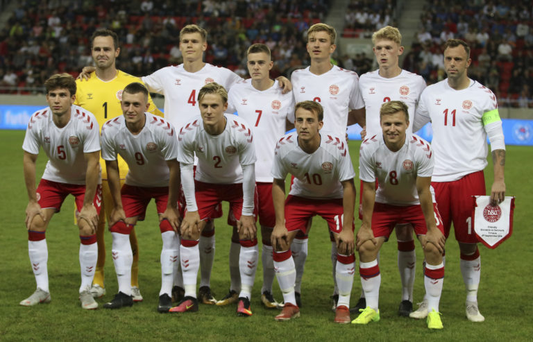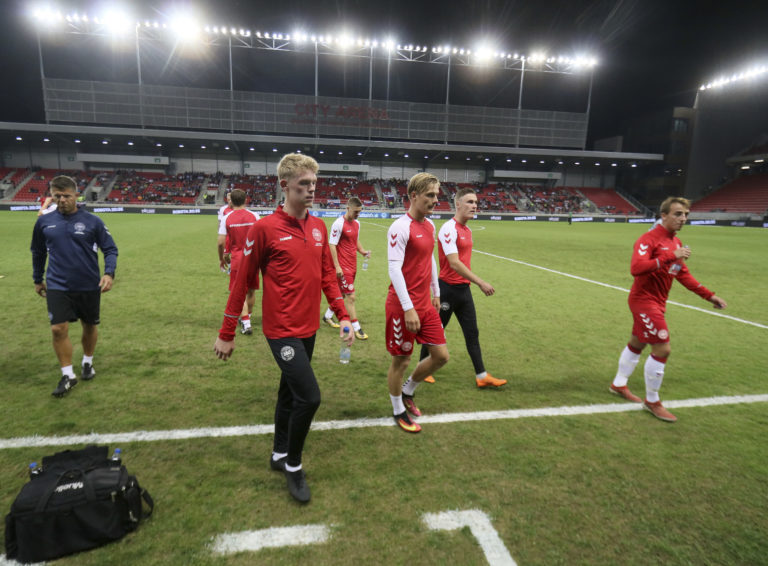 Futbalisti Dánska pred zápasom proti Slovensku na Štadióne Antona Malatinského. Trnava, 5. september 2018. Foto: SITA/AP.
