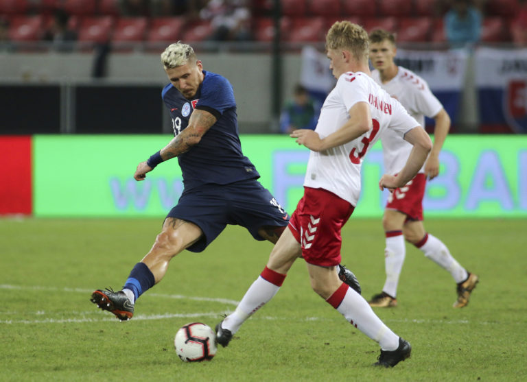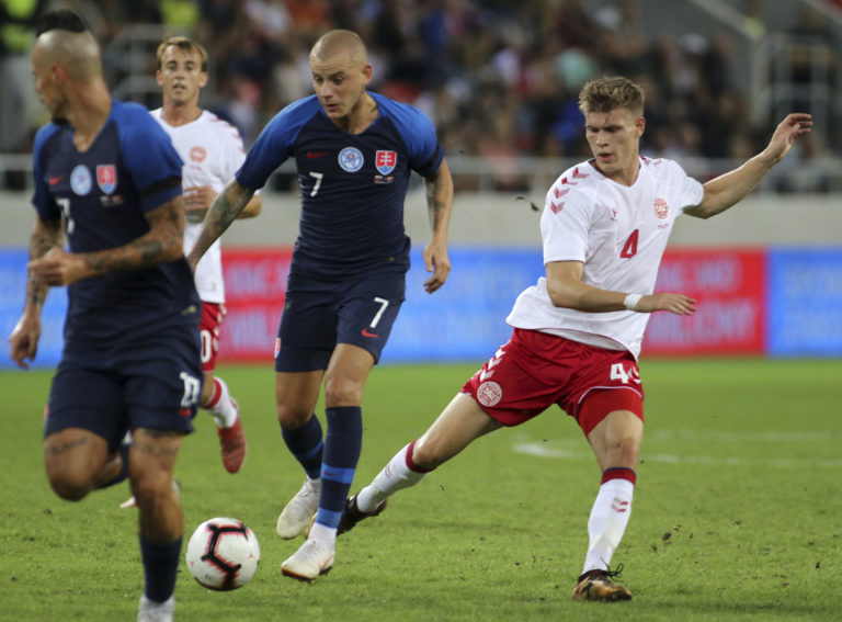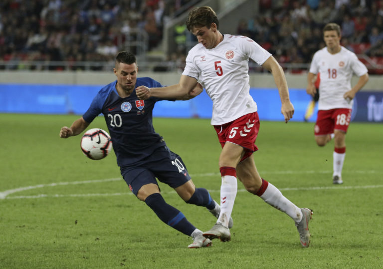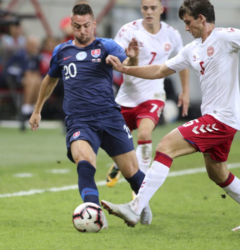 Slovenský futbalista Róbert Mak v súboji s Dánom Kasperom Kempelom počas medzištátneho zápasu na Štadióne Antona Malatinského. Trnava, 5. september 2018. Foto: SITA/AP.