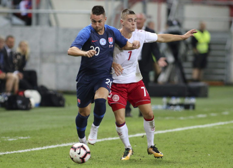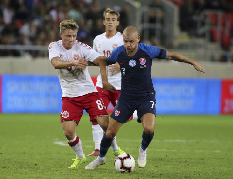 Slovenský futbalista Vladimir Weiss v súboji s Dánom Rasmusom Johanssonom počas medzištátneho zápasu na Štadióne Antona Malatinského. Trnava, 5. september 2018. Foto: SITA/AP.