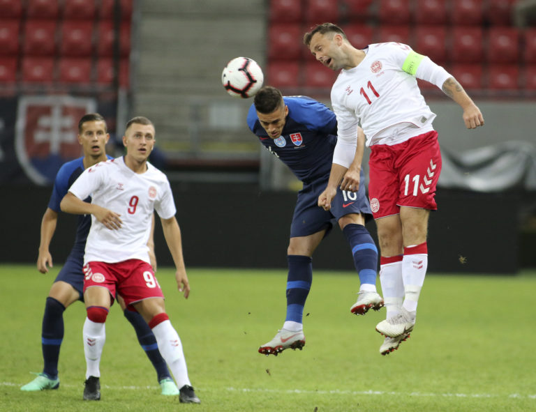 Dánsky futbalista Christian Offenberg v hlavičkovom súboji so Slovákom Róbertom Mazáňom počas medzištátneho zápasu na Štadióne Antona Malatinského. Trnava, 5. september 2018. Foto: SITA/AP.