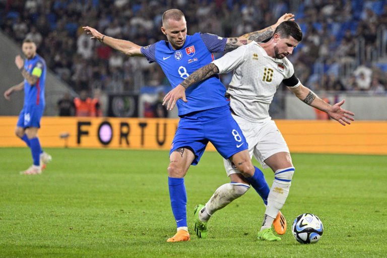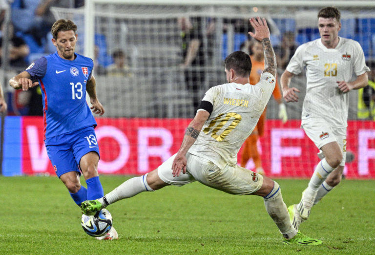Slovenský futbalista Lukáš Haraslín v súboji s Ferhatom Saglamom z Lichtenštajnska počas zápasu J-skupiny kvalifikácie o postup na Euro 2024. Bratislava, 11. september 2023. Foto: SITA/Milan Illík.