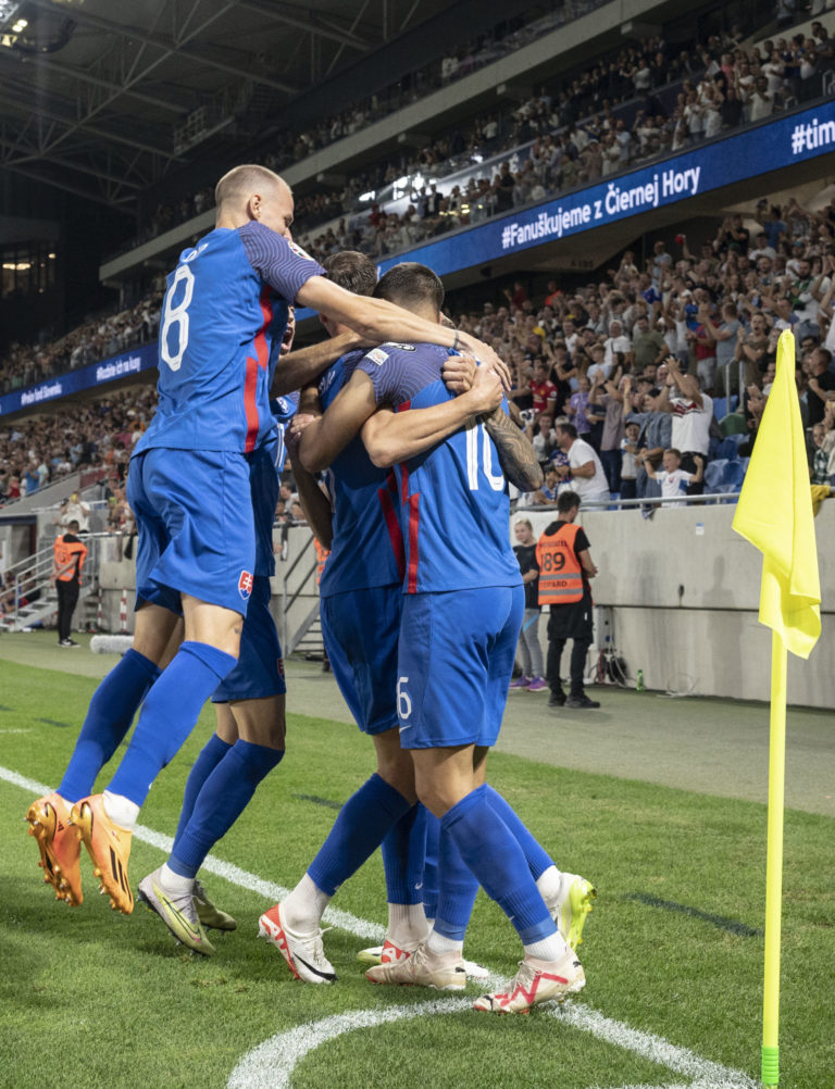 Radosť slovenských futbalistov po góle na 1:0 v zápase J-skupiny kvalifikácie o postup na Euro 2024 proti Lichtenštajnsku. Bratislava, 11. september 2023. Foto: SITA/Milan Illík.