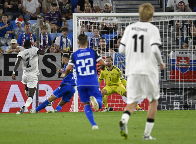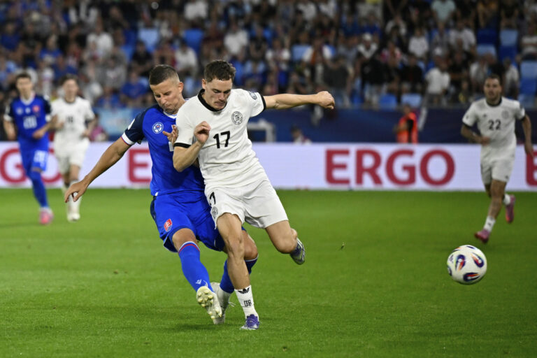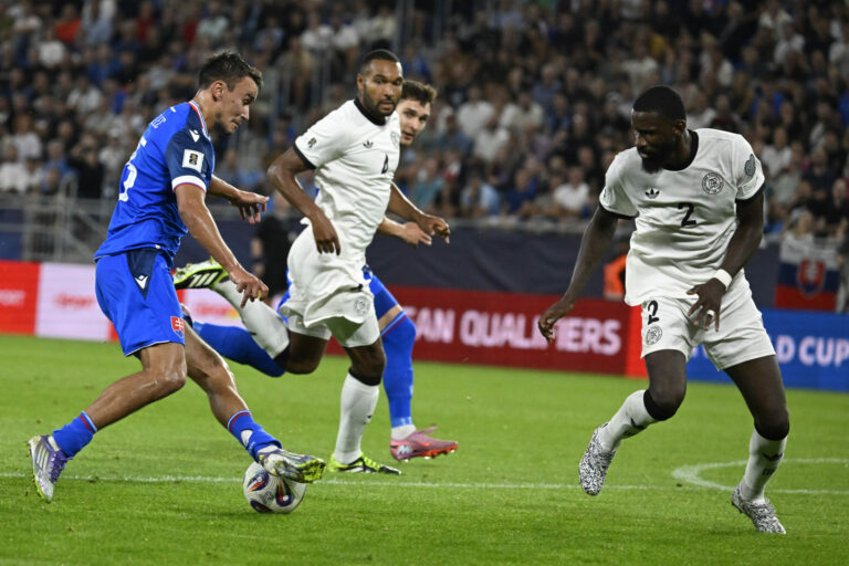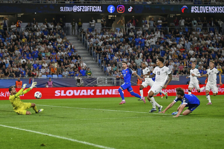 Kĺzačka Angela Stillera proti Ondrejovi Dudovi v zápase Slovensko - Nemecko v kvalifikácii o postup na MS vo futbale 2026. Bratislava (Národný futbalový štadión), 4. september 2025. Foto: SITA/AP.