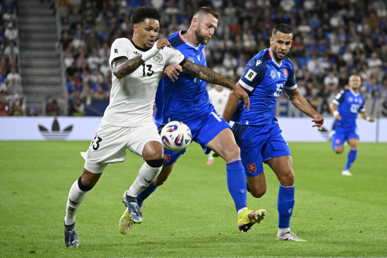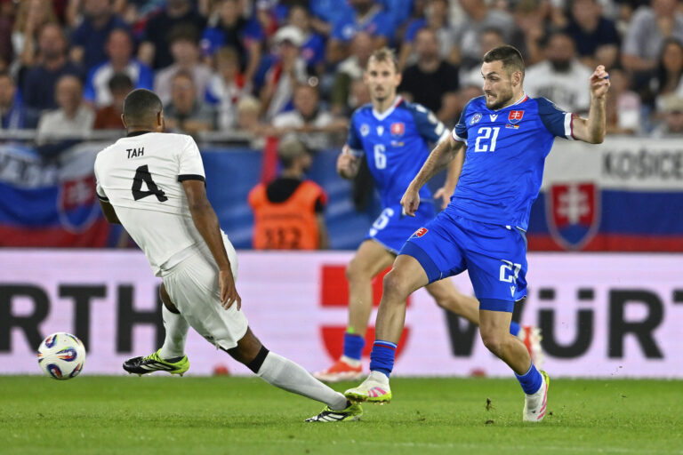 Leo Sauer sa výborne uvoľnil cez Nnamdiho Collinsa v zápase Slovensko - Nemecko v A-skupine kvalifikácie o postup na MS vo futbale 2026. Bratislava (Národný futbalový štadión), 4. september 2025. Foto: SITA/AP.