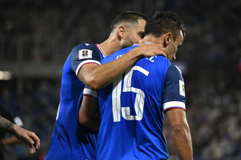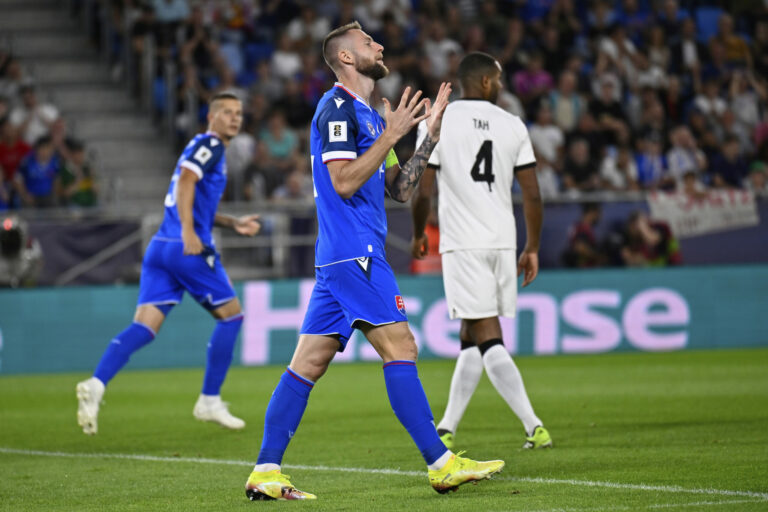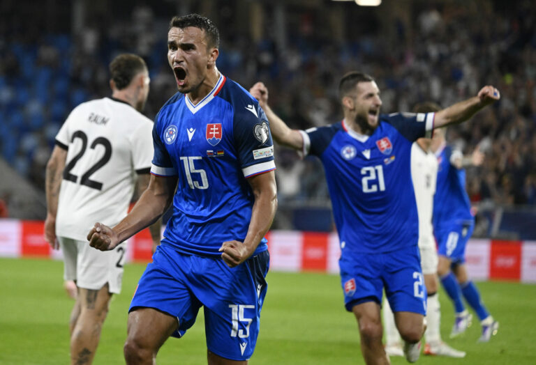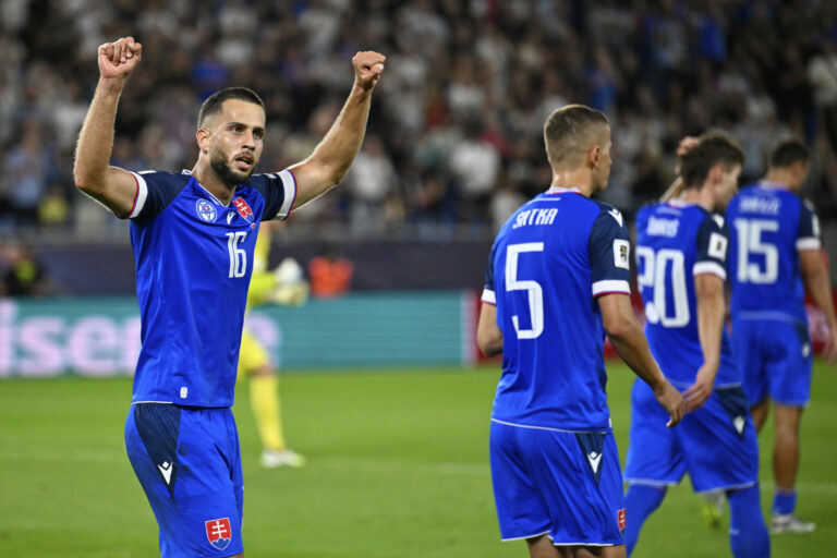 Radosť slovenských reprezentantov po góle Dávida Strelca na 2:0 v zápase proti Nemecku v kvalifikácii o postup na MS vo futbale 2026. Bratislava (Národný futbalový štadión), 4. september 2025. Foto: SITA/AP.