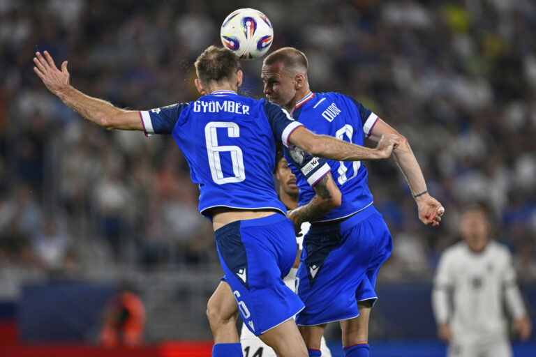 Slovenskí reprezentanti Norbert Gyömbér a Ondrej Duda v zápase proti Nemecku v kvalifikácii o postup na MS vo futbale 2026. Bratislava (Národný futbalový štadión), 4. september 2025. Foto: SITA/AP.