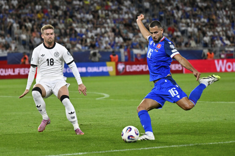 Slovenský reprezentant Dávid Strelec pred svojim gólom na 2:0 v zápase proti Nemecku v kvalifikácii o postup na MS vo futbale 2026. Bratislava (Národný futbalový štadión), 4. september 2025. Foto: SITA/Milan Illík.