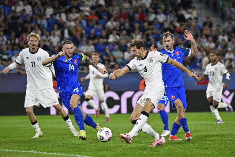 Strela nemeckého reprezentanta Leona Goretzku počas zápasu proti Slovensku v kvalifikácii o postup na MS vo futbale 2026. Bratislava (Národný futbalový štadión), 4. september 2025. Foto: SITA/AP.