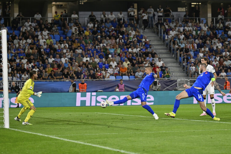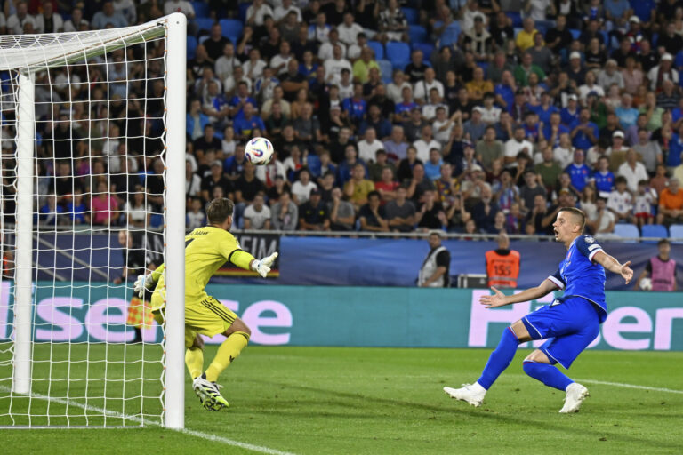 Šanca slovenského reprezentanta Ľubomíra Šatku v druhej minúte zápasu proti Nemecku v kvalifikácii o postup na MS vo futbale 2026. Bratislava (Národný futbalový štadión), 4. september 2025. Foto: SITA/AP.