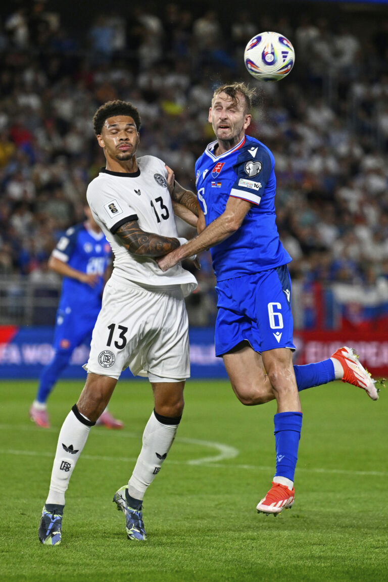 Slovenskí reprezentanti Norbert Gyömbér a Ľubomír Šatka v hlavičkovom súboji s Nemcom Nickom Woltemadem počas zápasu kvalifikácie o postup na MS vo futbale 2026. Bratislava (Národný futbalový štadión), 4. september 2025. Foto: SITA/AP.