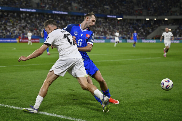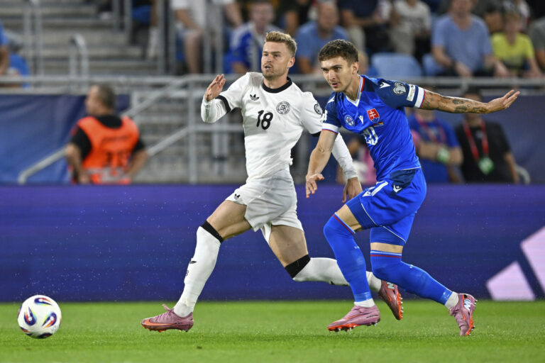 Norbert Gyömbér a David Raum počas zápasu Slovensko - Nemecko v kvalifikácii o postup na MS vo futbale 2026. Bratislava (Národný futbalový štadión), 4. september 2025. Foto: SITA/AP.