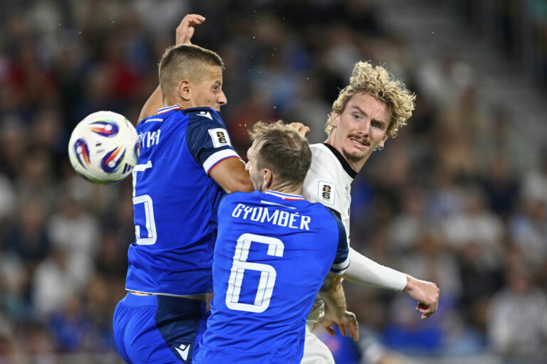 Nnamdi Collins v hlavičkovom súboji s Norbertom Gyömbérom v zápase Slovensko - Nemecko v kvalifikácii o postup na MS vo futbale 2026. Bratislava (Národný futbalový štadión), 4. september 2025: Foto: SITA/AP.