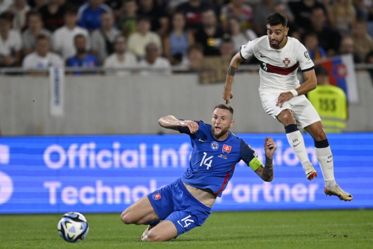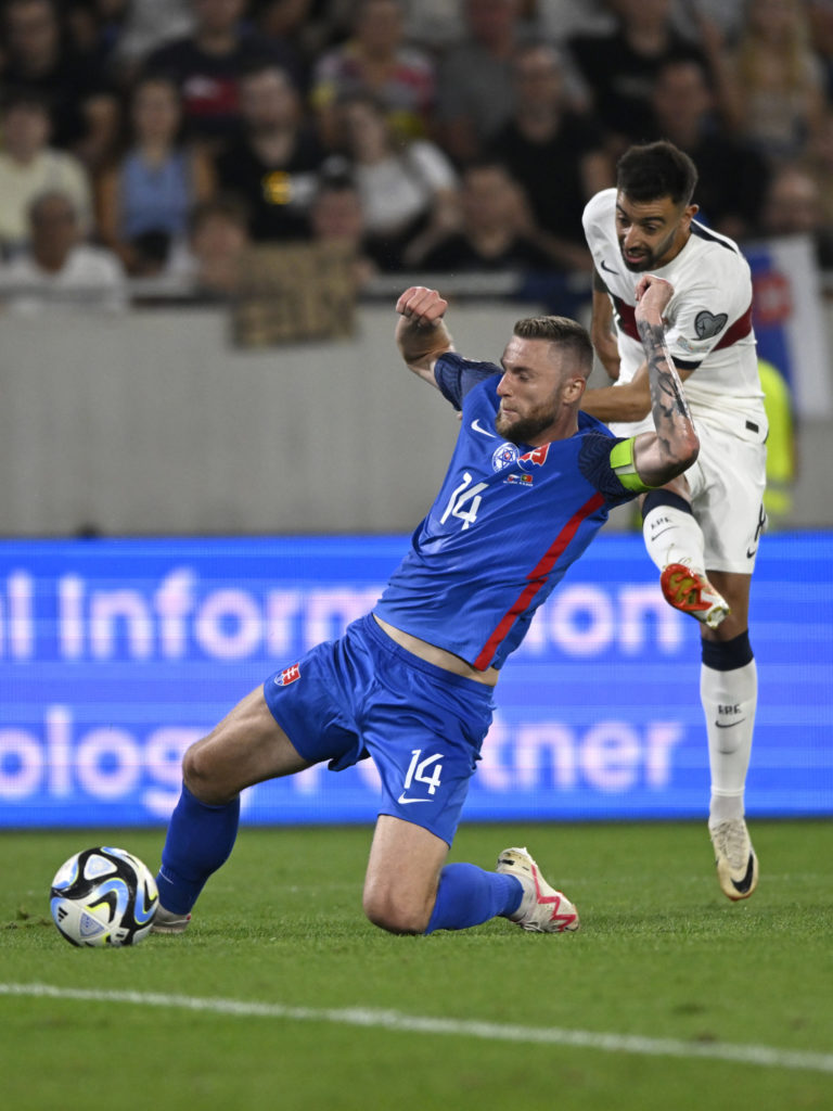 Slovenský futbalista Milan Škriniar v súboji s Portugalčanom Brunom Fernandesom počas zápasu J-skupiny kvalifikácie o postup na Euro 2024. Bratislava, 8. september 2023. Foto: SITA/AP.
