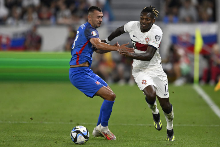 Potugalský futbalista Rafael Leao počas zápasu proti Slovensku v J-skupine kvalifikácie o postup na Euro 2024. Bratislava, 8. september 2023. Foto: SITA/AP.