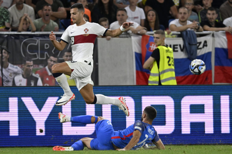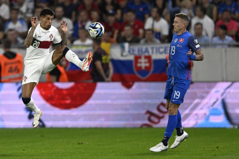 Slovenský reprezentant Dávid Hancko v súboji s Portugalčanom Diogom Dalotom počas zápasu J-skupiny kvalifikácie o postup na Euro 2024. Bratislava, 8. september 2023. Foto: SITA/AP.