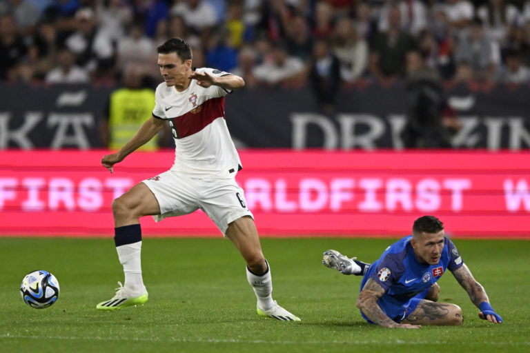 Slovenský futbalista Peter Pekarík počas zápasu proti Portugalsku v J-skupine kvalifikácie o postup na Euro 2024. Bratislava, 8. september 2023. Foto: SITA/AP.