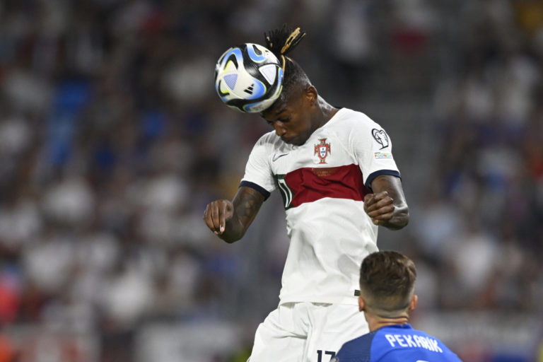Portugalský futbalista Rafael Leao hlavičkuje loptu počas zápasu proti Slovensku v J-skupine kvalifikácie o postup na Euro 2024. Bratislava, 8. september 2023. Foto: SITA/AP.