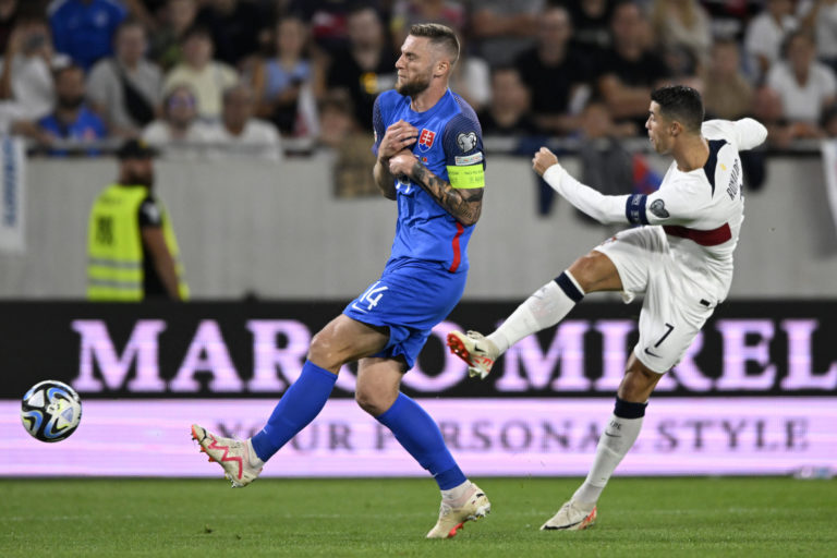 Slovenský futbalista Milan a Portugalčan Cristiano Ronaldo počas zápasu J-skupiny kvalifikácie o postup na Euro 2024. Bratislava, 8. september 2023. Foto: SITA/AP.