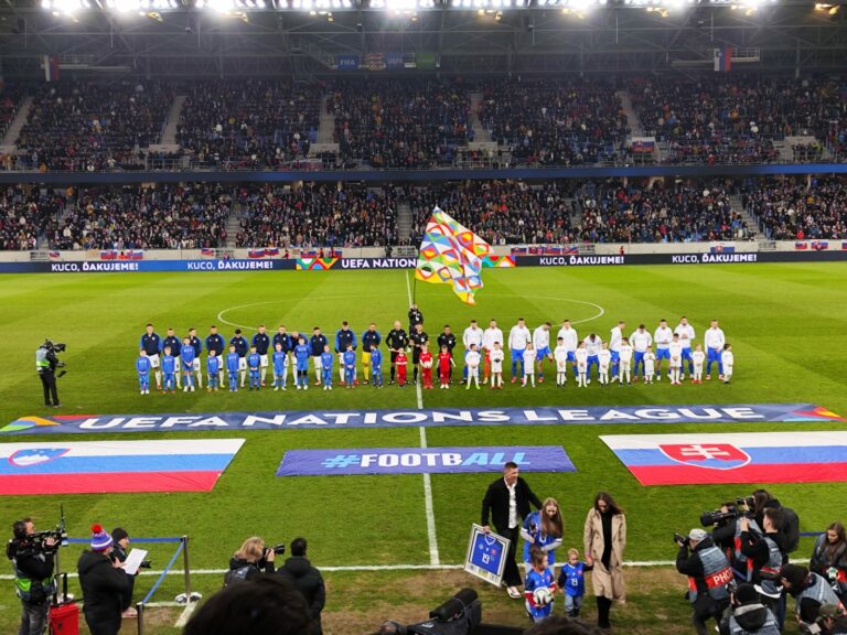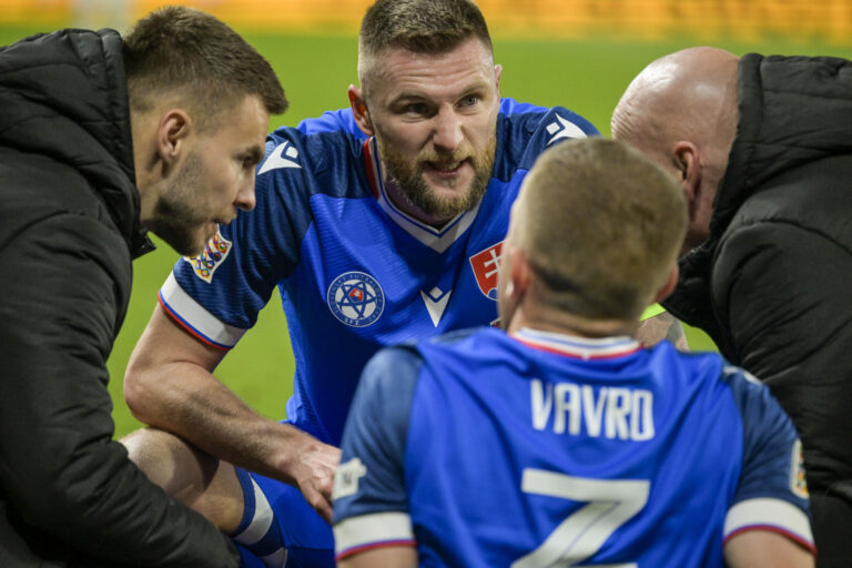 Futbalisti Slovenska a Slovinska pred prvým zápasom baráže o postup do B-divízie Ligy národov. Bratislava, 20. marec 2025. Foto: SITA/Patrik Mindžák.