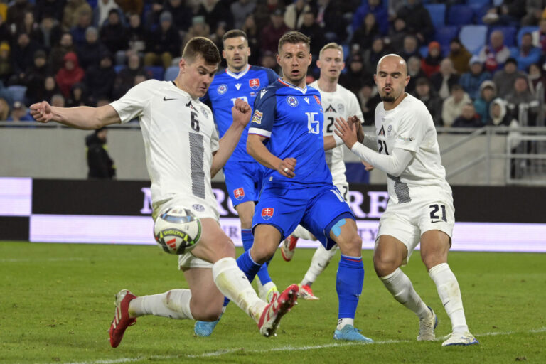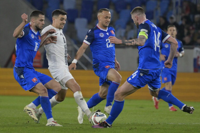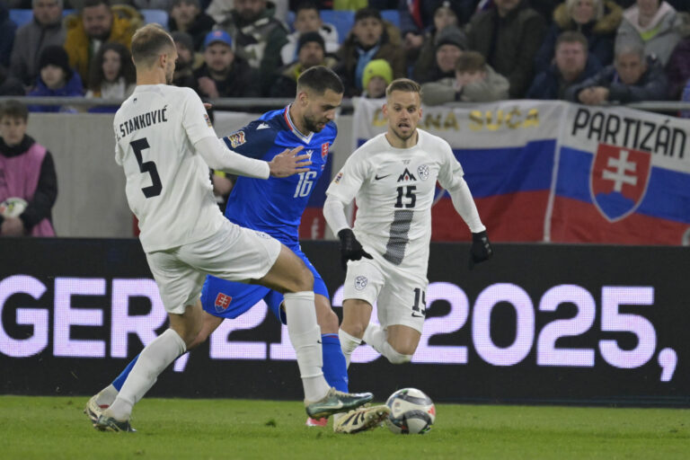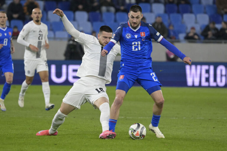 Jaka Bijol a Samuel Mráz počas prvého barážového zápasu o postup do B-divízie Ligy národov medzi Slovenskom a Slovinskom. Bratislava, 20. marec 2025. Foto: SITA/Milan Illík.
