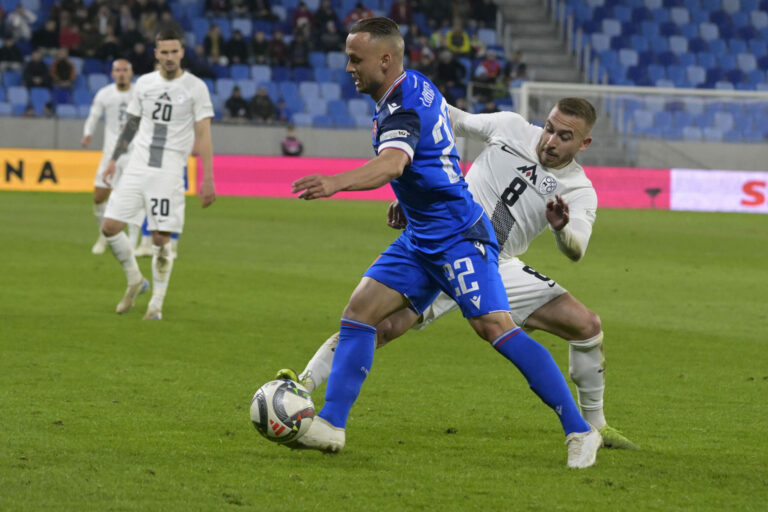 Jon Stanković v súboji s Dávidom Hanckom počas prvého barážového zápasu o postup do B-divízie Ligy národov medzi Slovenskom a Slovinskom. Bratislava, 20. marec 2025. Foto: SITA/Milan Illík.