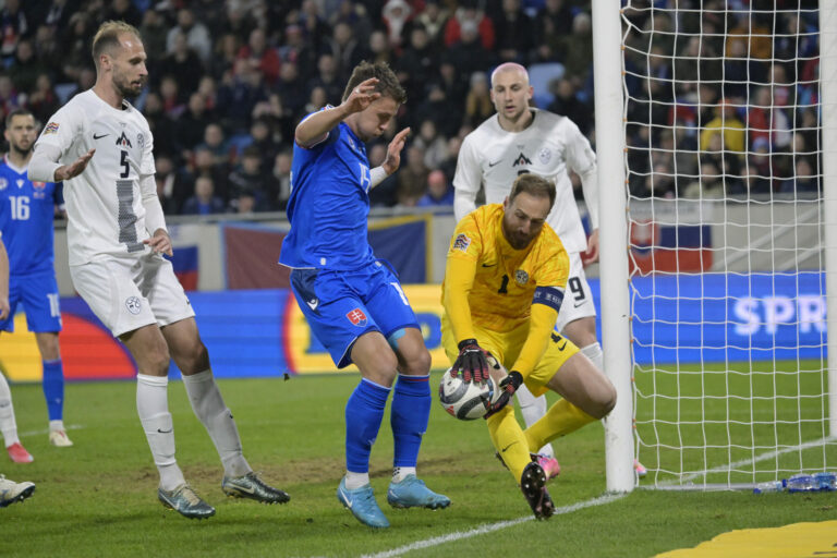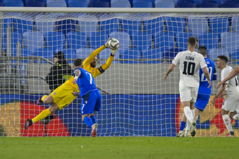 Zákrok Jana Oblaka po hlavičke Tomáša Suslova počas prvého barážového zápasu o postup do B-divízie Ligy národov medzi Slovenskom a Slovinskom. Bratislava, 20. marec 2025. Foto: SITA/Milan Illík.