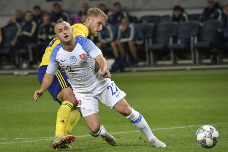 Švéd Sebastian Andersson, v súboji so slovenským futbalistom Stanislavom Lobotkom počas prípravného medzištátneho zápasu. Štokholm, 16. október 2018. Foto: Janerik Henriksson/TT News Agency via AP.