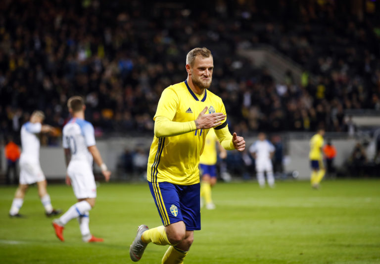 Švéd John Guidetti sa teší z gólu v sieti Slovenska počas prípravného medzištátneho zápasu. Štokholm, 16. október 2018. Foto: Janerik Henriksson/TT News Agency via AP.