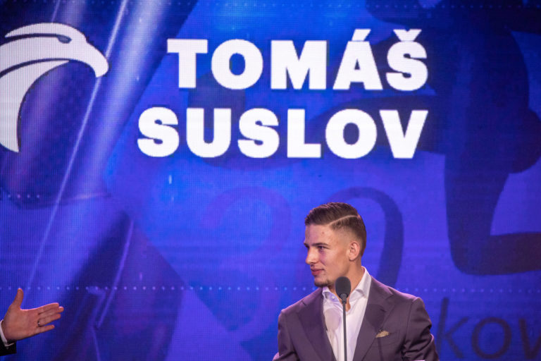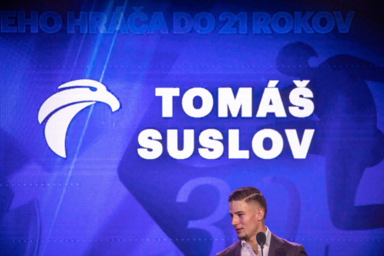 Víťaz ceny Petra Dubovského pre najlepšieho hráča do 21 rokov sa stal futbalista Tomáš Suslov počas vyhlásenia ankety Futbalista roka 2022. Senec, 20. marec 2023. Foto: SITA/Diana Černáková