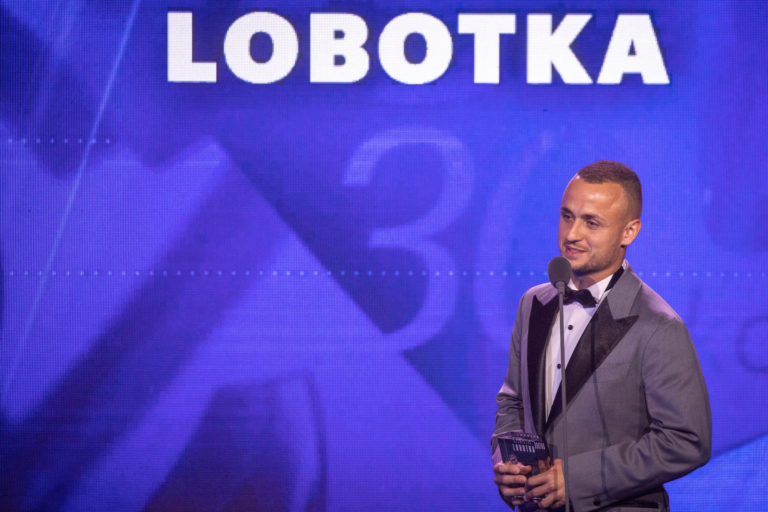 Slovenský futbalový reprezentant Stanislav Lobotka s Cenu fanúšika počas vyhlásenia ankety Futbalista roka 2022. Senec, 20. marec 2023. Foto: SITA/Diana Černáková