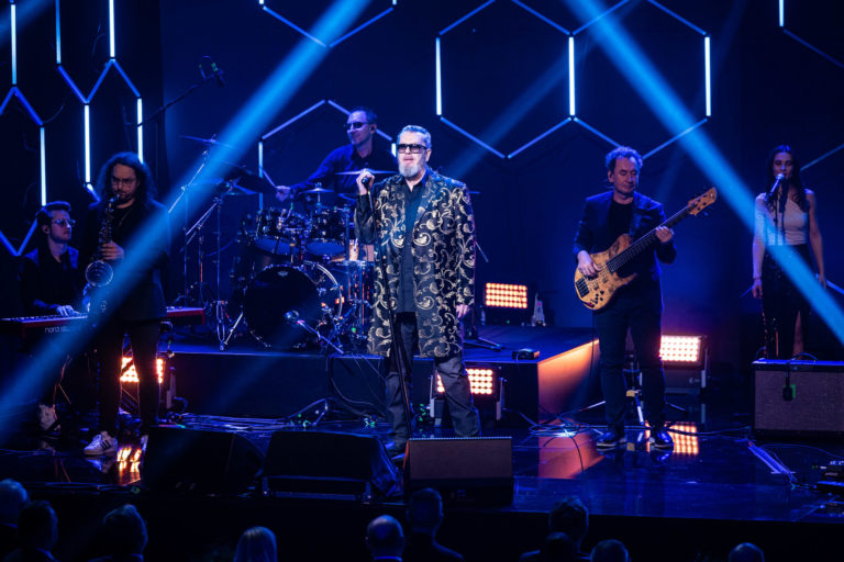 Spevák Richard Müller (uprostred) počas vyhlásenia ankety Futbalista roka 2023. Bratislava, 19. marec 2024. Foto: SITA/Jana Birošová.