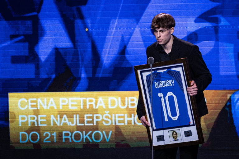 Futbalista Leo Sauer získal Cenu Petra Dubovského pre najlepšieho hráča do 21 rokov počas vyhlásenia ankety Futbalista roka 2023. Bratislava, 19. marec 2024. Foto: SITA/Jana Birošová.