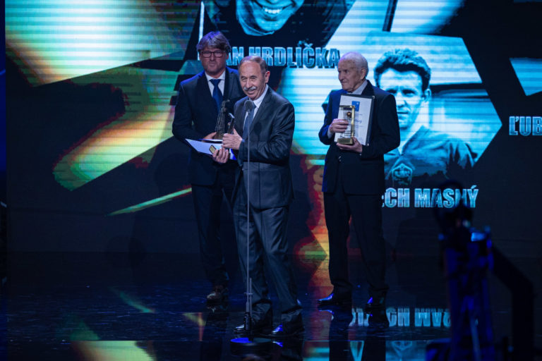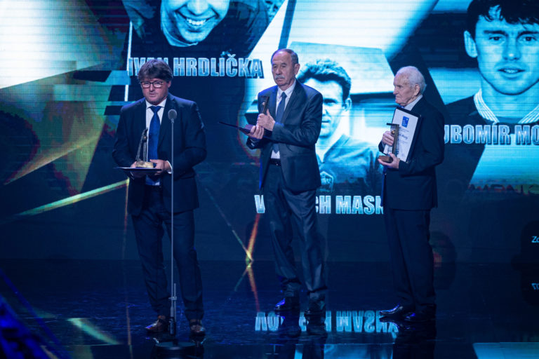 Sprava: Vojtech Masný, Ivan Hrdlička a Ľubomír Moravčík boli uvedení do siene slávy počas vyhlásenia ankety Futbalista roka 2023. Bratislava, 19. marec 2024. Foto: SITA/Jana Birošová.