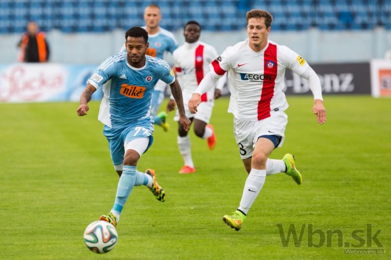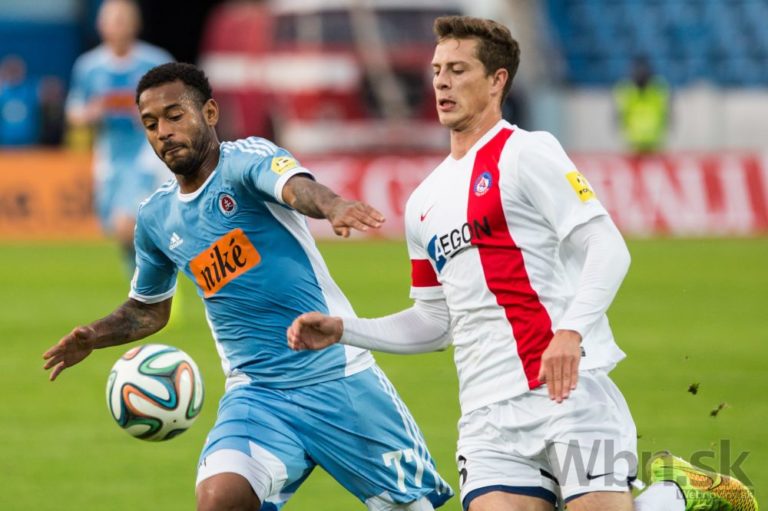 Zľava: Hráč Slovana Lester Peltier a hráč Trenčína James Lawrence počas dohrávky 2. kola Fortuna ligy 2014/15 medzi ŠK Slovan Bratislava a AS Trenčín. Bratislava, 24. september 2014. Foto: SITA/Jozef Jakubčo
