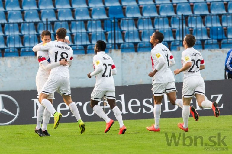 Hráči Trenčína sa tešia z gólu počas dohrávky 2. kola Fortuna ligy 2014/15 medzi ŠK Slovan Bratislava a AS Trenčín. Bratislava, 24. september 2014. Foto: SITA/Jozef Jakubčo