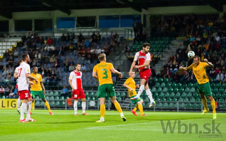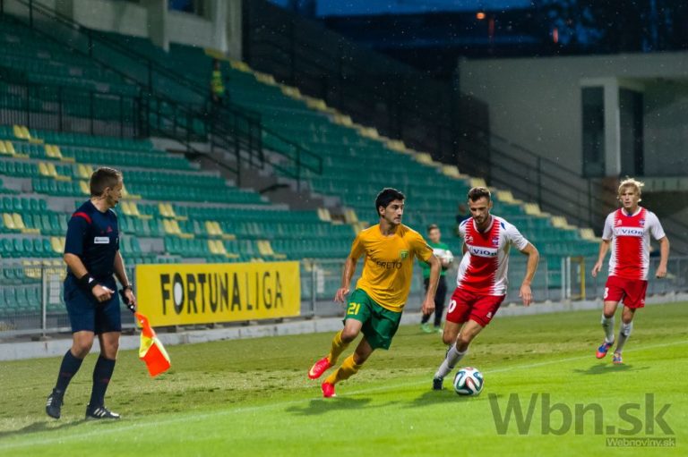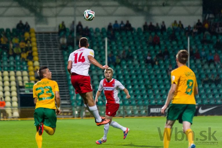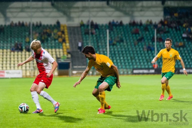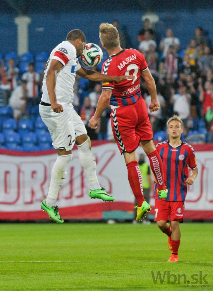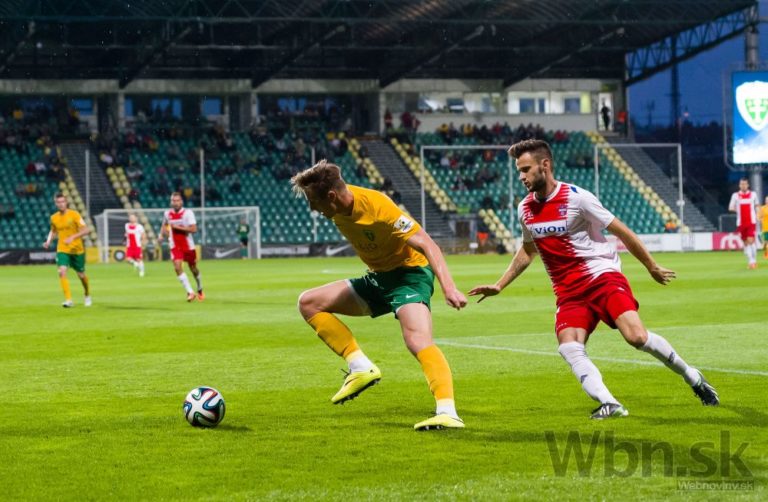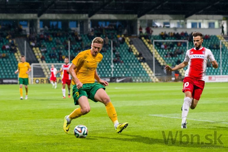 Zľava: Filip Hlohovský z FK Senica a Alexander Lawrence z AS Trenčín v zápase 7. kola futbalovej Fortuna ligy 2014/15 medzi FK Senica a AS Trenčín. Senica, 22. august 2014. Foto: SITA/Martin Medňanský