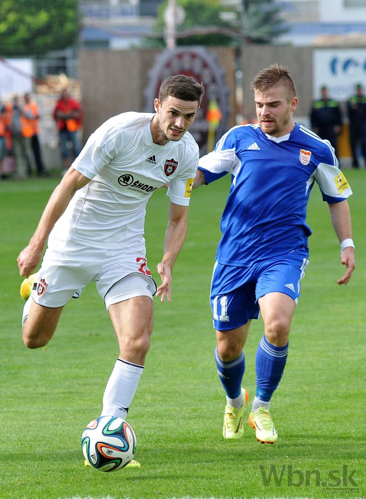 Nikolas Špalek z Trnavy (hore) a Saša Savič z Banskej Bystrice v zápase 10. kola Fortuna ligy 2014/2015 medzi FC Spartak Trnava a FK Dukla Banská Bystrica. Trnava, 16. september 2014. Foto: SITA/Ivan Kopčáni