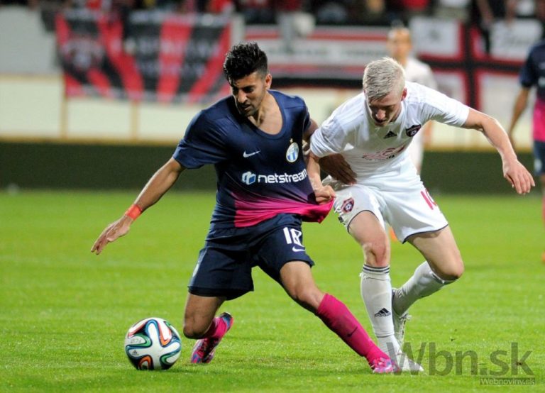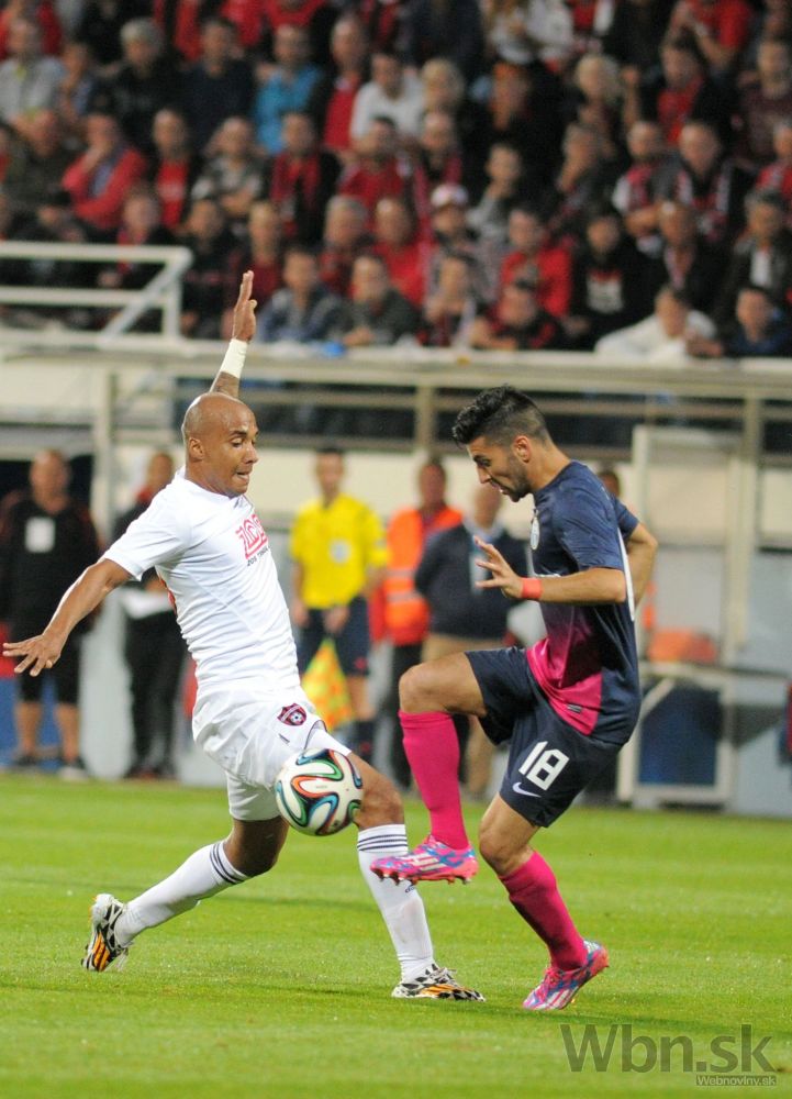 Kamil Kuzma z FC Spartak Trnava (vľavo) a Phillippe Koch z FC Zürich (vpravo) počas prvého zápasu play-off Európskej ligy 2014/2015 medzi FC Spartak Trnava - FC Zürich. Zlaté Moravce, 21. august 2014. Foto: SITA/Martin Havran