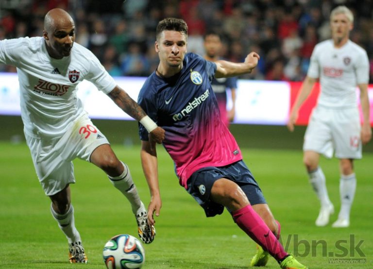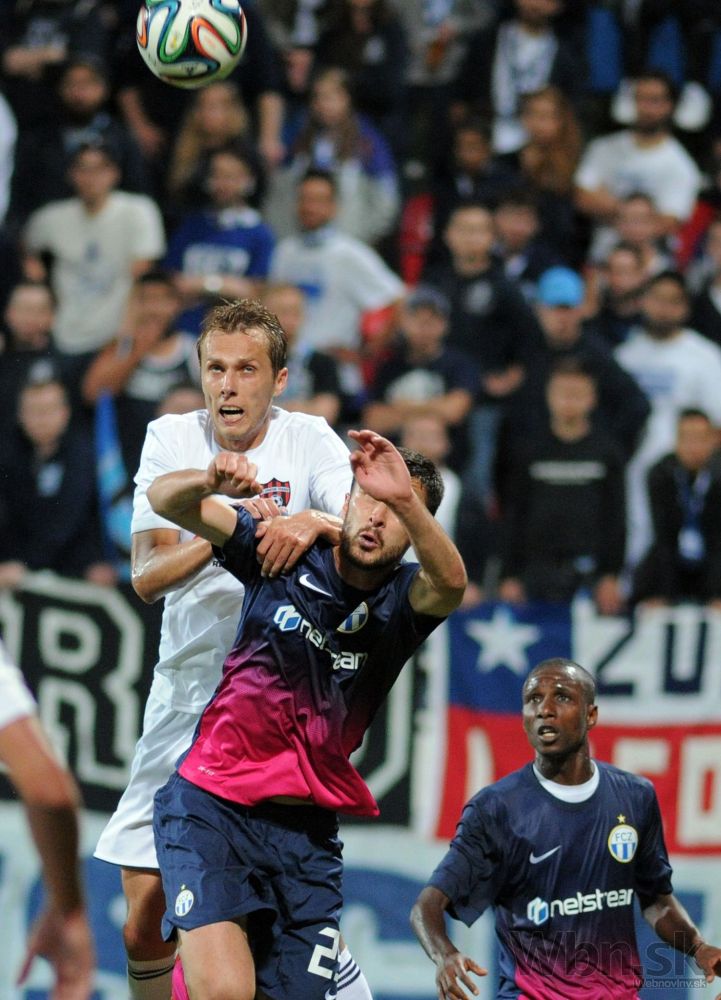 Erik Jendrišek z FC Spartak Trnava (vpravo) a Ivan Kecojevič z FC Zürich (vľavo) počas prvého zápasu play-off Európskej ligy 2014/2015 medzi FC Spartak Trnava - FC Zürich. Zlaté Moravce, 21. august 2014. Foto: SITA/Martin Havran