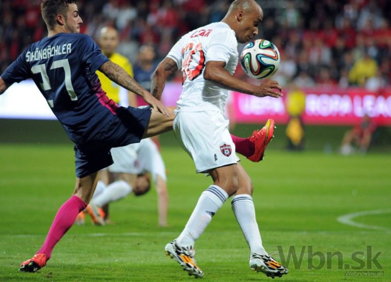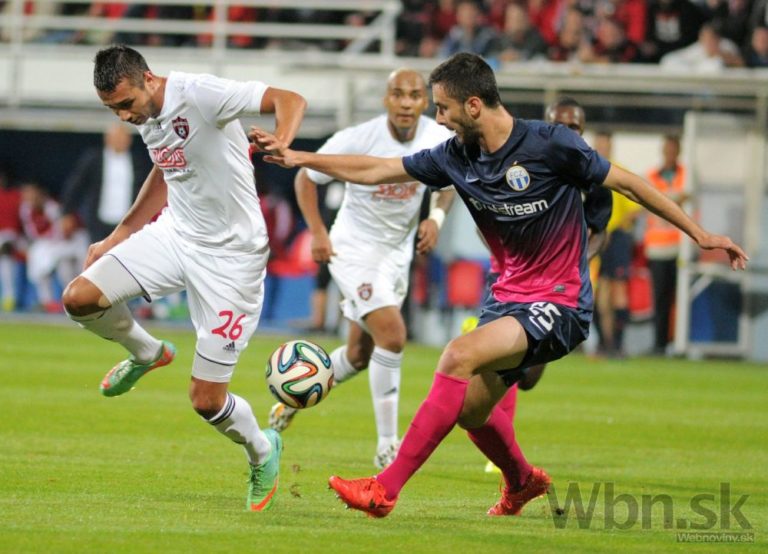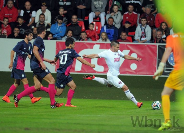 Erik Jendrišek z FC Spartak Trnava (v strede) počas prvého zápasu play-off Európskej ligy 2014/2015 medzi FC Spartak Trnava - FC Zürich. Zlaté Moravce, 21. august 2014. Foto: SITA/Martin Havran