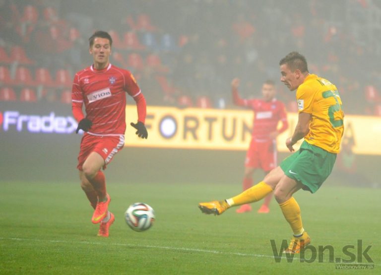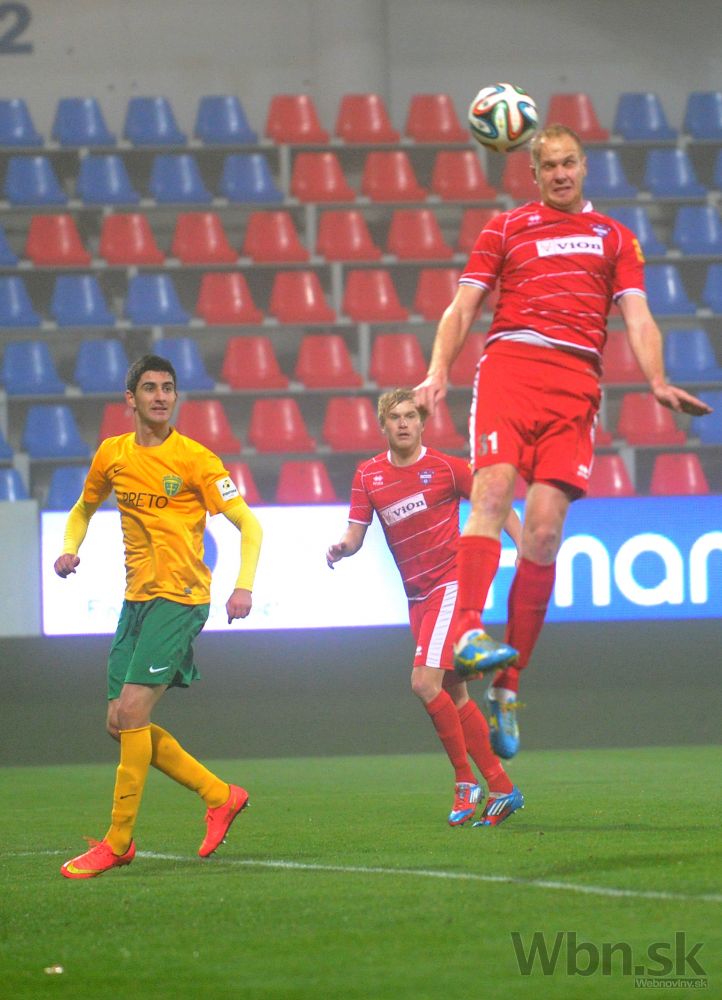 Futbalista Zlatých Moraviec Karol Pavelka (vpravo) hlavičkuje loptu počas 18. kola futbalovej Fortuna ligy medzi FC Vion a MŠK Žilina. Zlaté Moravce, 21. november 2014. Foto: SITA/Martin Havran